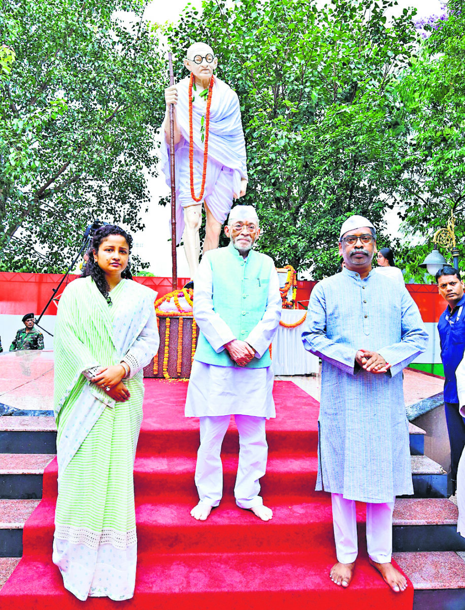 रांची. गांधी जयंती पर दो अक्तूबर को राज्यपाल संतोष कुमार गंगवार, मुख्यमंत्री हेमंत सोरेन एवं विधायक कल्पना सोरेन ने मोरहाबादी स्थित बापू वाटिका में राष्ट्रपिता महात्मा गांधी की प्रतिमा पर माल्यार्पण कर श्रद्धा सुमन अर्पित किया. इस अवसर पर मुख्यमंत्री ने कहा कि महात्मा गांधी के विचार आज भी प्रेरणास्रोत हैं. उन्होंने कहा कि आज का दिन भारत के इतिहास का स्वर्णिम दिवस है. उनके सिद्धांतों ने न केवल स्वतंत्रता संग्राम को नयी दिशा दी, बल्कि आजादी के बाद भी लोकतंत्र को मजबूत करने में अहम भूमिका निभायी. सीएम ने राज्यवासियों से आह्वान किया कि हम सभी अपने जीवन में पूरी संजीदगी से बापू के सिद्धांतों को अपनायें और समाज में शांति, भाईचारा एवं एकता के माहौल को और मजबूती दें.