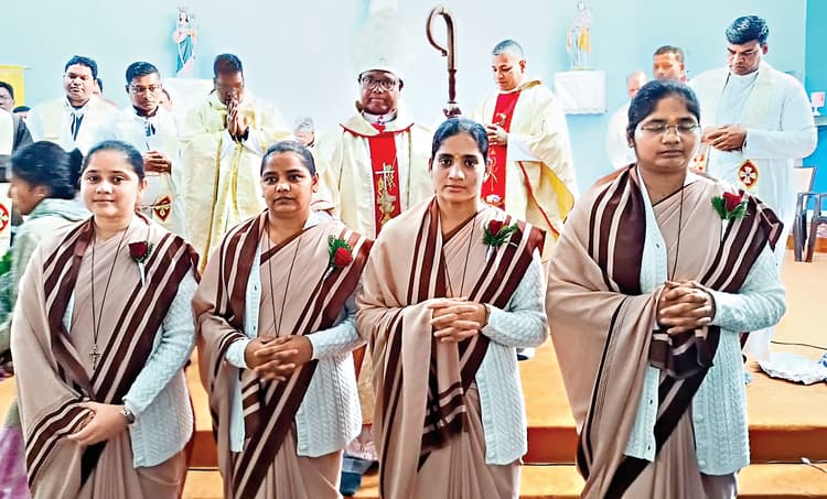 प्रेरितों की रानी धर्मसंघ की चार धर्म बहनों ने आजीवन व्रत धारण कियारांची. आर्चबिशप विंसेंट आइंद के समक्ष प्रेरितों की रानी धर्मसंघ की चार धर्म बहनों ने शनिवार को संत वियान्नी चर्च, चान्हो में आजीवन व्रत धारण किया. सिस्टर जेसिका कोली, सिस्टर प्रीति सोनी, सिस्टर स्नेहलता आइंद एवं सिस्टर सुषमा लकड़ा ने पवित्रता, निर्धनता और आज्ञापालन का व्रत धारण किया. यह व्रत धारण समारोह पवित्र मिस्सा बलिदान के साथ आरंभ हुआ. इस अवसर पर अपने उपदेश में आर्चबिशप ने कहा कि हमारा मुख्य लक्ष्य प्रभु की सेवा करना और उसके प्रेम के लिए अपने जीवन को पूर्ण समर्पण करना है.