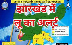 मौसम केंद्र के प्रमुख ने प्रभात खबर (prabhatkhabar.com) को बताया कि कोल्हान प्रमंडल के 3 जिलों में 4 अप्रैल 2024 से लू चलने की चेतावनी दी गई है. मौसम विभाग ने कहा कि सरायकेला-खरसावां, पूर्वी सिंहभूम और पश्चिमी सिंहभूम में कहीं-कहीं लू चलेगी.