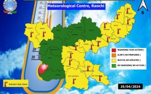 मौसम वैज्ञानिक ने बताया कि 25 और 26 अप्रैल को कोल्हान के तीनों जिलों पूर्वी सिंहभूम, पश्चिमी सिंहभूम और सरायकेला-खरसावां जिले में उष्ण लहर रहेगी. उत्तरी छोटानागपुर प्रमंडल के बोकारो एवं धनबाद जिलों के साथ-साथ संताल परगना के जामताड़ा, दुमका, पाकुड़, गोड्डा और साहिबगंज जिलों में कहीं-कहीं हीट वेव की स्थिति देखी जाएगी.