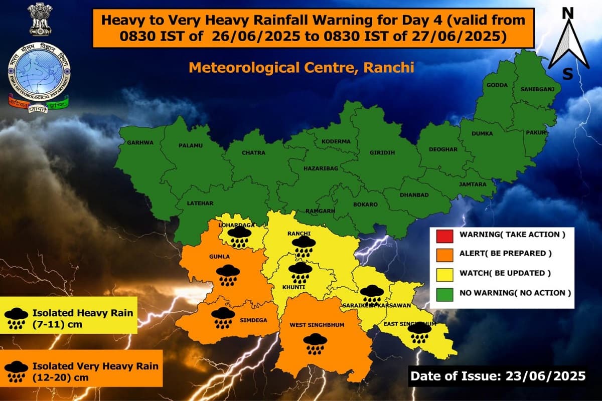 इधर, मौसम विभाग के अनुसार, झारखंड में 24 जून से भारी बारिश की आशंका जतायी गयी है. 24 जून से 27 जून तक जोरदार बारिश का अलर्ट है. इस दौरान 26 जून को कई जिलों में बारिश का ऑरेंज अलर्ट भी जारी किया गया है. इन जिलों में गुमला, सिमडेगा और पश्चिम सिंहभूम शामिल हैं.