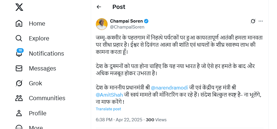 चंपाई सोरेन ने आगे लिखा, ‘देश के दुश्मनों को पता होना चाहिए कि यह नया भारत है, जो ऐसे हर हमले के बाद और अधिक मजबूत होकर उभरता है. देश के माननीय प्रधानमंत्री नरेंद्र मोदी और केंद्रीय गृह मंत्री अमित शाह स्वयं मामले की मॉनिटरिंग कर रहे हैं. संदेश बिल्कुल स्पष्ट है- न भूलेंगे, न माफ करेंगे!’