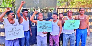 Ranchi News: होटल रांची अशोक के मुख्य द्वार पर सोमवार को कर्मचारियों ने अर्द्धनग्न प्रदर्शन किया.