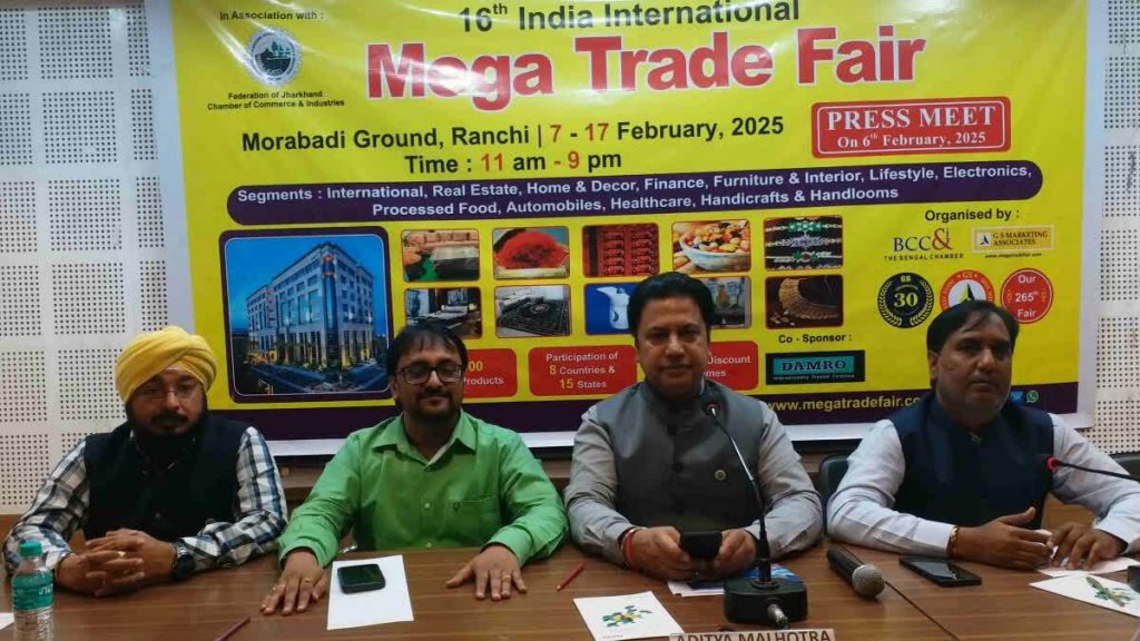 रांची. 10 दिवसीय इंडिया इंटरनेशनल मेगा ट्रेड फेयर सात फरवरी से मोरहाबादी मैदान में शुरू हो रहा है. खास बात यह है कि इस मेगा ट्रेड फेयर में आठ देश और झारखंड सहित कुल 15 राज्य शामिल हो रहे हैं. यह बातें झारखंड चेंबर के महासचिव आदित्य मल्होत्रा ने गुरुवार को चेंबर भवन में आयोजित संवाददाता सम्मेलन में कही. उन्होंने कहा कि झारखंड चेंबर और जीएस मार्केटिंग एसोसिएट्स के संयुक्त तत्वावधान में आयोजित मेगा ट्रेड फेयर में रियल एस्टेट, होम एंड डेकोर, फाइनांस, लाइफस्टाइल, फर्नीचर एंड इंटीरियर, ऑटोमोबाइल, इलेक्ट्रॉनिक्स, प्रोसेस्ड फूड, हेल्थकेयर, हैंडीक्राफ्ट्स सहित 35,000 से अधिक प्रोडक्ट की प्रदर्शनी लगायी जायेगी.