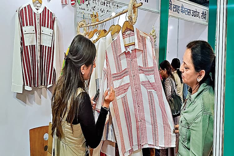 जिसकी कीमत 1000 से 3500 रुपये तक है. उन्होंने बताया कि हम अपने कपड़ो पर प्राकृतिक रंगों द्वारा अपने ही कारीगरों द्वारा पेंटिंग या कढ़ाई करवाते है, जिससे कि पहनने वाले को उसके नेचुरल लुक का आभास होता है. साथ ही हमारी कोशिश है कि हम अपनी लोक संस्कृति को अपने काम के माध्यम से लोगो तक पहुंचायें. जिसमे ट्राइबल डांस, इंस्ट्रूमेंट, प्रकृति की झलक मिलती है. ट्राइबल महिलाएं शादी के पहले हरे रंग की साड़ी और शादी के बाद लाल रंग की साड़ी पहनती हैं, जिसकी बिक्री यहां की जा रही है. जोहार ग्राम के नाम से झारखंड के पारंपरिक परिधानों को बेचने वाले आशीष सत्यव्रत साहू ने बताया की उनके द्वारा बेचे जा रहे कपडे पारंपरिक और ओर्गेनिक है, ये कपडे झारखंड के आदिवासी समुदाय जैसे खड़िया, मुंडा, उरांव आदि उपयोग करते हैं| पैवेलियन में झारखंड की पिनदना साड़ी जो की प्रदेश महिलाएं विशेष अवसरों पर पहनती हैं,