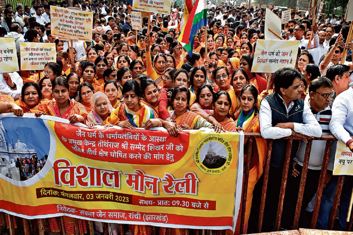 गिरिडीह स्थित श्री सम्मेद शिखरजी पारसनाथ पर्वतराज को पर्यटन स्थल घोषित किये जाने के विरोध में मंगलवार को राजधानी में विशाल मौन पदयात्रा निकाली गयी. इसमें बड़ी संख्या में जैन समाज, मारवाड़ी समाज और अन्य संगठनों के पुरुष व महिलाएं शामिल थे. दूसरी तरफ सम्मेद शिखर की पवित्रता बनाये रखने के लिए जयपुर में आमरण-अनशन कर रहे जैन मुनि सुज्ञेयसागर महाराज ने मंगलवार सुबह छह बजे अपने प्राण त्याग दिये.
