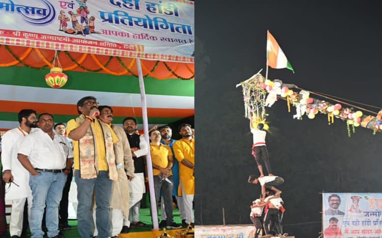 Janmashtami 2022: रांची के मोरहाबादी मैदान में श्री कृष्ण जन्माष्टमी आयोजन समिति की ओर से श्री कृष्ण जन्मोत्सव एवं दही-हांडी प्रतियोगिता का आयोजन हुआ. इस मौके पर मुख्यमंत्री हेमंत सोरेन ने झारखंड वासियों को श्री कृष्ण जन्माष्टमी की शुभकामनाएं दी है. उन्होंने कहा कि कोरोना महामारी के कारण हम भगवान श्री कृष्ण के जन्मोत्सव को इतने हर्षोल्लास से नहीं मना पा रहे थे. आज दो साल बाद हम एक साथ फिर से एकत्रित हुए हैं. यह परंपरा ऐसे ही आगे बढ़ते रहे. कहा कि आज खुशी का दिन है. भगवान श्री कृष्ण हमसब पर अपना आशीर्वाद बनाये रखें. उनकी कृपा से अगले वर्ष भी हम इसी प्रकार एकत्रित होकर श्री कृष्ण जन्मोत्सव धूमधाम से मनाएं.