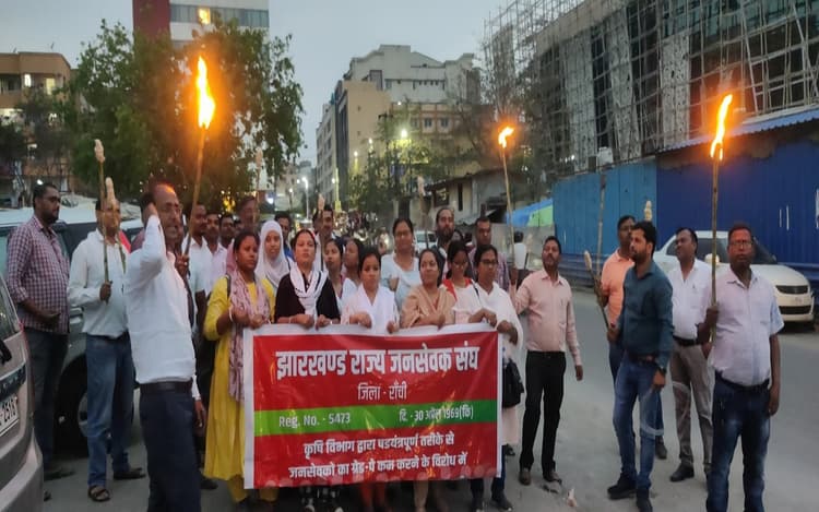 झारखंड सरकार के कृषि विभाग द्वारा जनसेवकों का ग्रेड पे 2400 से घटाकर 2000 करने के विरोध में आज सोमवार को रांची जिले के सभी जनसेवकों ने जनसेवक संघ, रांची की अध्यक्ष महिमा इरूस लकड़ा की अगुवाई में जयपाल सिंह स्टेडियम से अल्बर्ट एक्का चौक तक मशाल जुलूस निकाला. अध्यक्ष ने कहा कि झारखंड राज्य जनसेवक संघ के आह्वान पर क्रमिक आंदोलन के क्रम में आज मशाल जुलूस निकाला गया. उन्होंने कहा कि 11 वर्षों की सेवा के बाद ग्रेड पे घटाना अत्यंत निराशाजनक है.