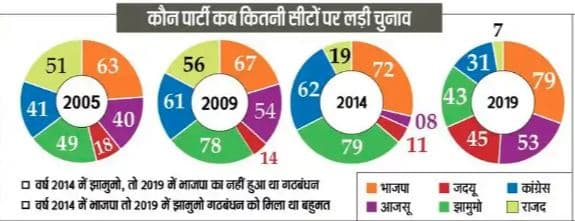 राज्य में भाजपा को वर्ष 2014 के चुनाव में सबसे अधिक 37 सीटें मिली थीं. वहीं, झामुमो को 2019 के चुनाव में सबसे अधिक 30 सीटें मिली थीं. वर्ष 2019 में कांग्रेस को भी सबसे अधिक 16 सीटों पर जीत मिली थी. राज्य में भाजपा का जदयू के साथ दो चुनाव के बाद गठबंधन हुआ है. वर्ष 2014 व 2019 के चुनाव में भाजपा का जदयू के साथ गठबंधन नहीं हुआ था.