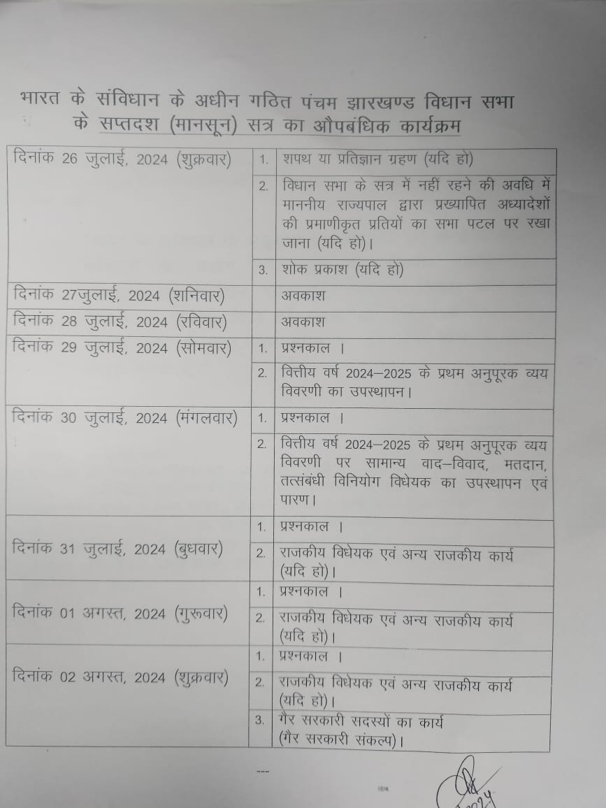 झारखंड विधानसभा में 30 जुलाई को अनुपूरक बजट पर चर्चा की जाएगी. 31 जुलाई को प्रश्न काल और राजकीय विधेयक एवं अन्य राजकीय कार्य किए जाएंगे. इस तरह 2 अगस्त तक मानसून सत्र चलेगा. मानसून सत्र में कुल छह कार्यदिवस होंगे.