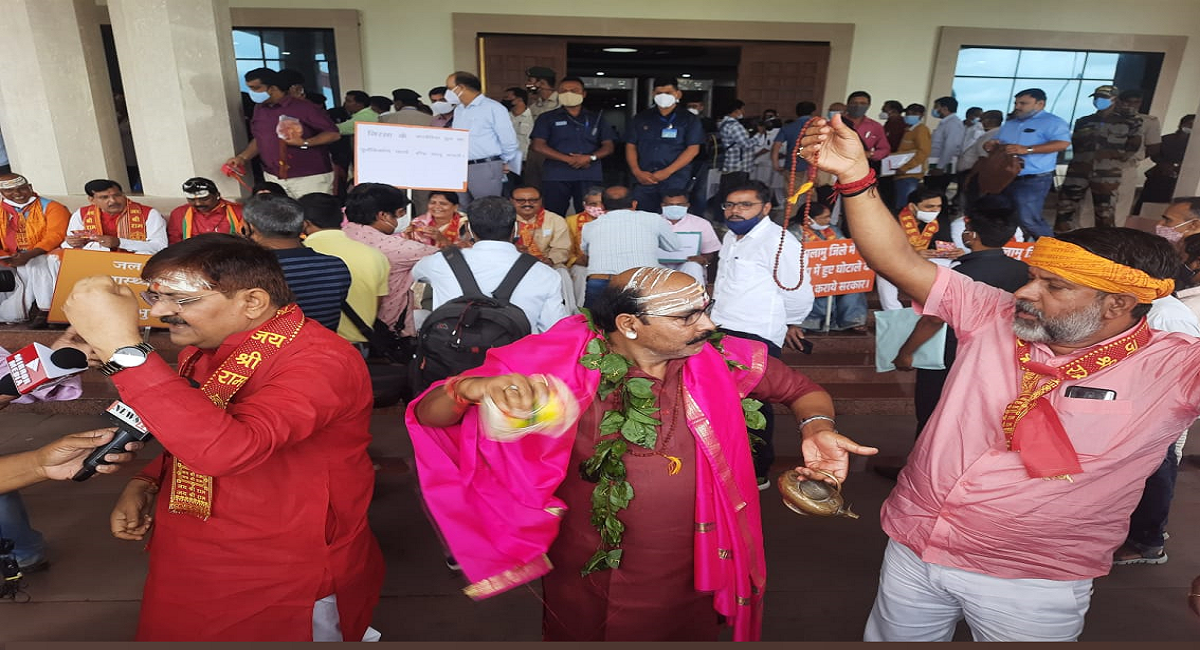 झारखंड विधानसभा के मानसूत्र सत्र शुरू होने से पहले ही आज बीजेपी विधायक सदन के बाहर प्रदर्शन करने लगे. हनुमान चालीसा का पाठ करने लगे. देवघर से बीजेपी विधायक नारायण दास बेलपत्र की माला पहनकर सदन पहुंचे और सदन के बाहर प्रदर्शन करने लगे. उनका साथ अन्य बीजेपी विधायकों ने दिया. इस दौरान अन्य बीजेपी विधायक हनुमान चालीसा का पाठ करने लगे. कल भी नमाज के लिए अलग कमरा आवंटिन किए जाने से नाराज बीजेपी विधायकों ने जमकर हंगामा किया. हंगामे के बीच ही अनुपूरक बजट पेश हो गया था. बीजेपी विधायक सभी धर्मों के लिए अलग-अलग कमरे आवंटित करने की मांग कर रहे हैं या फिर इस आदेश को रद्द करने की मांग पर अड़े हैं.