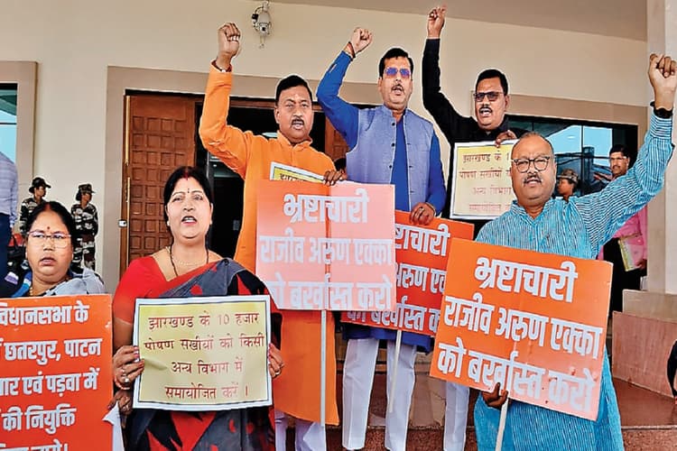 भाजपा विधायकों ने शनिवार को आइएएस राजीव अरुण एक्का को बर्खास्त करने और हेमंत सरकार के कार्यकाल में भ्रष्टाचार की सीबीआइ जांच की मांग की. भाजपा विधायक तख्तियां लेकर विधानसभा के मुख्य द्वार पर धरना-प्रदर्शन किया और सरकार विरोधी नारेबाजी की. विधायक बिरंची नारायण ने कहा कि जब राजीव अरुण एक्का पर आरोप लगा तो सरकार ने उनका तबादला कर दिया. यह सजा नहीं है. सरकार अगर उन पर सही तरीके से कार्रवाई करती, तो उन्हें बर्खास्त करती है.