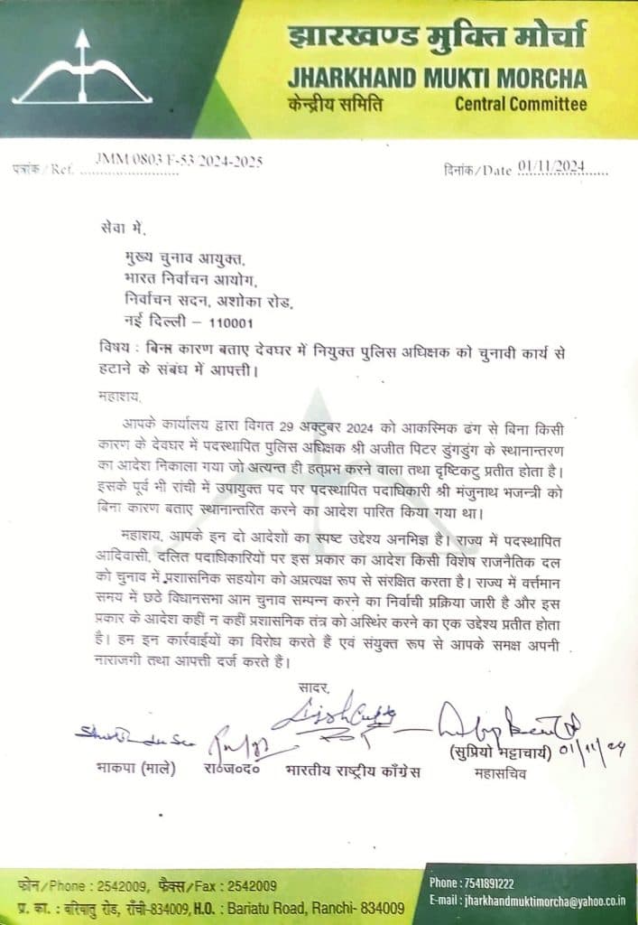 झारखंड मुक्ति मोर्चा (झामुमो) के लेटर पैड पर लिखी गई इस चिट्ठी में बिना कारण बताए देवघर में तैनात एसपी को चुनावी कार्य से हटाने संबंधी चुनाव आयोग के आदेश पर आपत्ति जताई गई है. मुख्य चुनाव आयुक्त को संबोधित इस चिट्ठी में झामुमो-कांग्रेस नीत गठबंधन ने कहा है कि 29 अक्टूबर को चुनाव आयोग के कार्यालय से एक आदेश जारी किया गया. इस आदेश में देवघर में पदस्थापित एसपी अजित पीटर डुंगडुंग का तबादला करने का आदेश था. यह आदेश हतप्रभ करने वाला और दृष्टिकटु प्रतीत होता है.