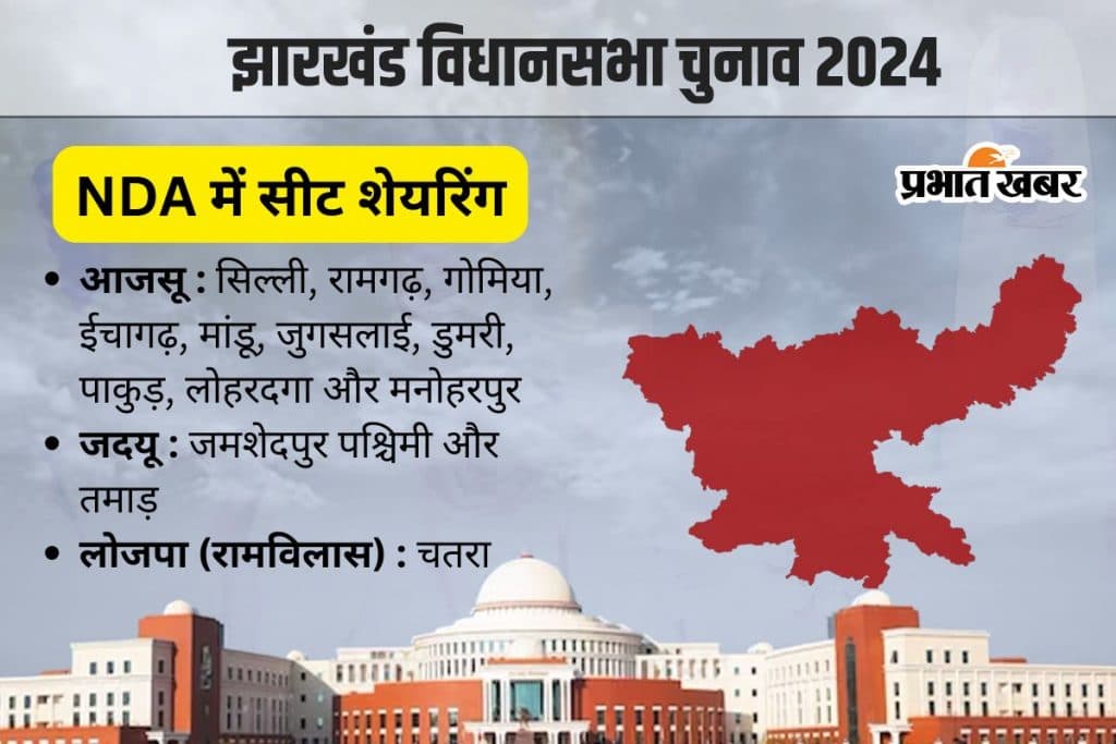 Jharkhand Chunav 2024: झारखंड विधानसभा चुनाव के लिए एनडीए में सीट शेयरिंग हो गई है. आजसू को 10, जदयू को 2 और लोजपा (आर) के हिस्से 1 सीट आई है.