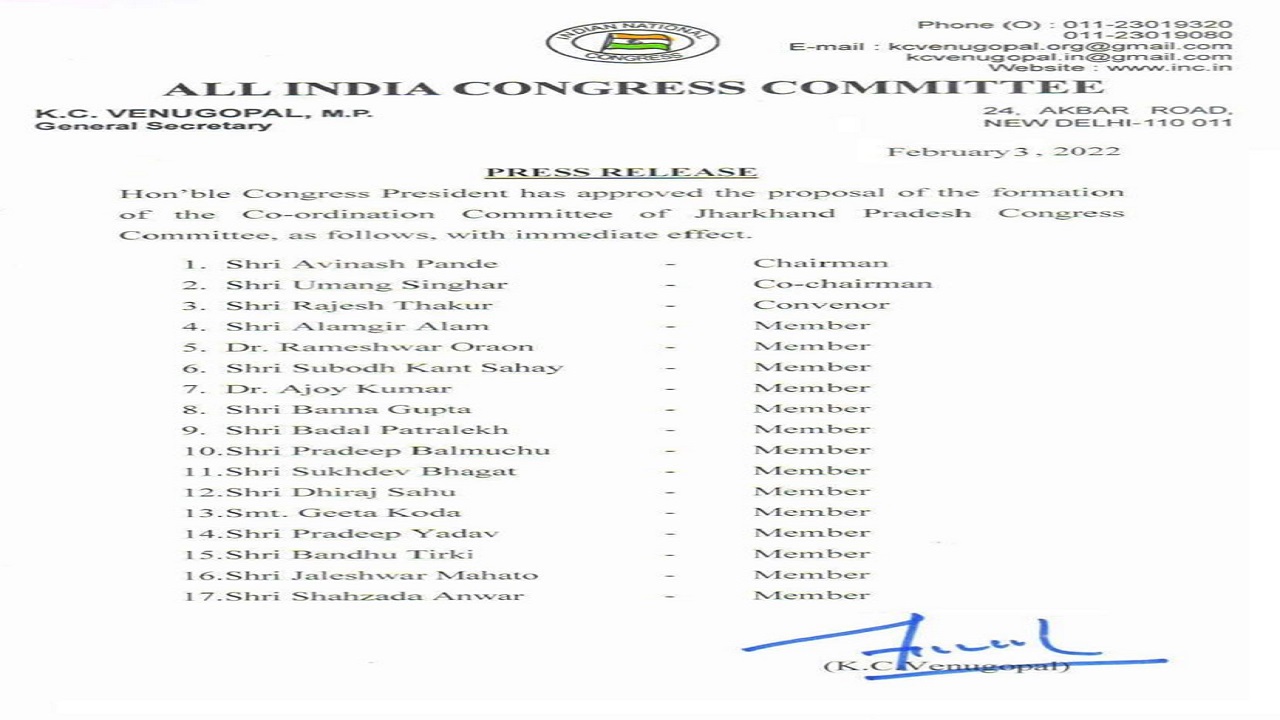 कांग्रेस अध्यक्ष सोनिया गांधी द्वारा झारखंड कांग्रेस को-ऑर्डिनेशन कमेटी के जिस प्रस्ताव को मंजूरी दी गयी है, उसमें कांग्रेस प्रभारी अविनाश पांडेय को चेयरमैन, जबकि उमंग सिंघार को को- चेयरमैन बनाया गया है. झारखंड कांग्रेस अध्यक्ष राजेश ठाकुर संयोजक हैं. ग्रामीण विकास मंत्री आलमगीर आलम समेत 14 को सदस्य बनाया गया है. हाल के दिनों में कांग्रेस में घर वापसी किए प्रदीप बलमुचु व सुखदेव भगत को भी इस कमेटी में जगह दी गयी है. इन्हें सदस्य बनाया गया है.