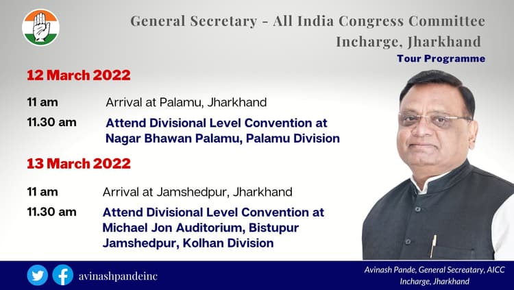 झारखंड के कांग्रेस प्रभारी अविनाश पांडे 13 मार्च को सुबह 8.30 बजे सड़क मार्ग द्वारा रांची से जमशेदपुर के लिए प्रस्थान करेंगे. 11.00 बजे जमशेदपुर पहुंचेंगे. 11:30 बजे से माइकल जॉन ऑडिटोरियम बिष्टुपुर (जमशेदपुर) में आयोजित प्रमंडल स्तरीय सम्मेलन में भाग लेंगे. इसके बाद 03:30 बजे रांची के लिए प्रस्थान करेंगे. शाम 6.30 बजे रांची आगमन के बाद रात 8.00 बजे बिरसा मुंडा एयरपोर्ट, रांची से नई दिल्ली के लिए प्रस्थान करेंगे.