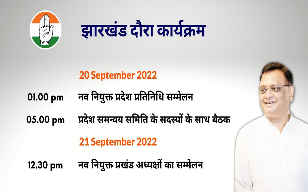 आपको बता दें कि 21 सितंबर (बुधवार) को सुबह 11 बजे से रांची के मोरहाबादी स्थित संगम गार्डेन बैंक्वेट हॉल में झारखंड के सभी प्रखंडों के नवनियुक्त अध्यक्षों का संकल्प सम्मेलन आयोजित किया गया है. ये जानकारी झारखंड प्रदेश कांग्रेस प्रवक्ता राजीव रंजन प्रसाद की ओर से दी गयी है.