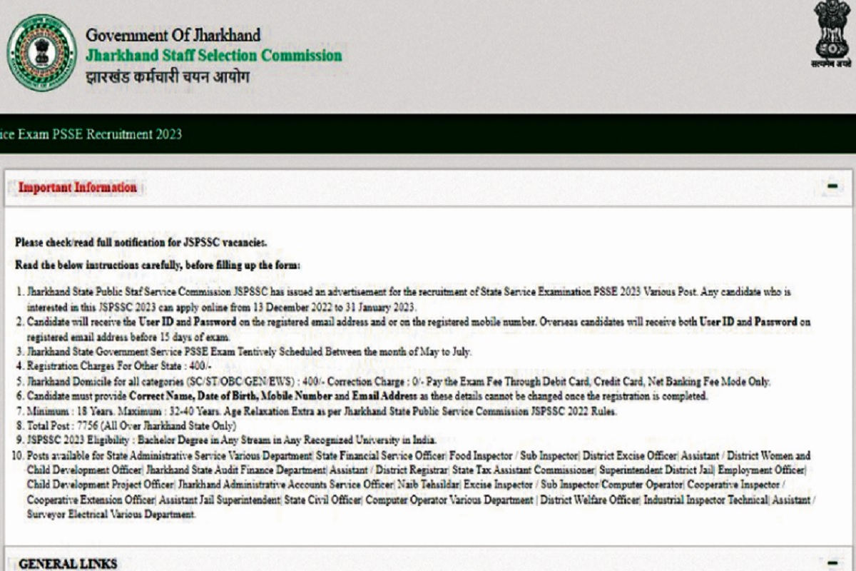 उक्त वेबसाइट पर प्रकाशित विज्ञापन में कहा गया है कि झारखंड स्टेट पब्लिक सर्विस कमीशन विभिन्न पदों के लिए योग्य अभ्यर्थियों से ऑनलाइन आवेदन आमंत्रित करता है. 13 दिसंबर से लेकर 31 जनवरी 2023 तक ऑनलाइन आवेदन दिया जा सकेगा. सभी कैटेगरी के अभ्यर्थियों के लिए झारखंड का डोमिसाइल होना जरूरी है. दूसरे राज्य के लिए रजिस्ट्रेशन शुल्क 400 रुपये लगेगा. अभ्यर्थियों से 13 दिसंबर से ही आवेदन के साथ ही शुल्क वसूला जा रहा है.