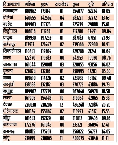 कई विधानसभा क्षेत्रों में युवाओं की संख्या भी बढ़ी है. ऐसे युवा बेहतर भविष्य के लिए मतदान कर सकते हैं. राज्य में 28 विधानसभा क्षेत्र ऐसे हैं, जहां 2019 की तुलना में 10 प्रतिशत से ज्यादा मतदाता बढ़े हैं. पांच विधानसभा क्षेत्रों में 20 प्रतिशत से अधिक मतदाता बढ़े हैं. इनमें जमुआ, पाकुड़, बगोदर, धनवार और देवघर हैं. सबसे ज्यादा 22 प्रतिशत से अधिक मतदाता गिरिडीह जिले के जमुआ विधानसभा में बढ़े हैं. वहीं, 22 विधानसभा क्षेत्रों में 10 से 15 प्रतिशत के बीच मतदाता बढ़े हैं. इन नये मतदाताओं को रिझाने के लिए सभी राजनीतिक दलों ने पूरी ताकत झोंकी है.