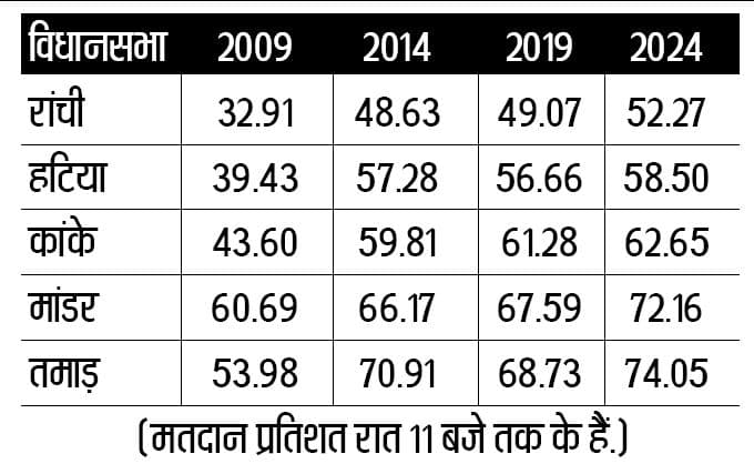 रांची विधानसभा का मतदान प्रतिशत हर चुनाव में बहुत मामूली बढ़ता है. पिछले चुनाव की तुलना में मतदान प्रतिशत में सबसे अधिक वृद्धि वर्ष 2014 के चुनाव में दर्ज की गयी थी. उस वर्ष 2009 की तुलना में मतदान प्रतिशत 15.72 बढ़ा था. उसके बाद 2019 में मतदान प्रतिशत में केवल 0.44 की वृद्धि हुई थी. 2024 के चुनाव में भी गत चुनाव से 3.20 प्रतिशत ही मतदान में वृद्धि दर्ज की गयी है.