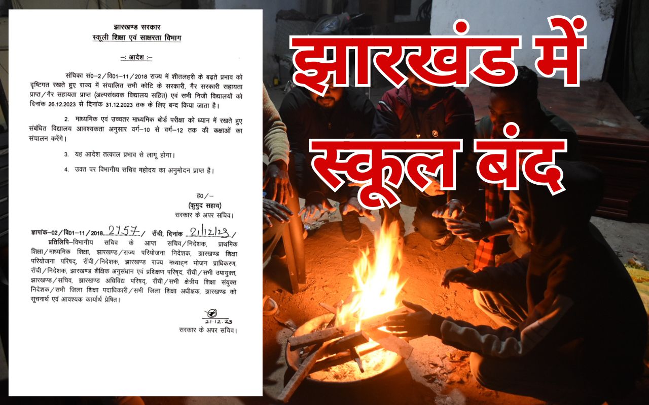 झारखंड में शीतलहर को देखते हुए सभी सरकारी स्कूलों को बंद करने के आदेश जारी कर दिए गए हैं. झारखंड सरकार के स्कूली शिक्षा एवं साक्षरता विभाग की ओर से बृहस्पतिवार (21 दिसंबर) को इसका आदेश जारी किया गया. इसमें कहा गया है कि राज्य में शीतलहर के बढ़ते प्रभाव को देखते हुए राज्य के सभी सरकारी, गैर-सरकारी सहायता प्राप्त/गैर सहायता प्राप्त (अल्पसंख्यक स्कूल सहित) एवं सभी निजी स्कूलों को बंद किया जाता है. कहा गया है कि झारखंड के ये सभी स्कूल 26 दिसंबर से 31 दिसंबर 2023 तक बंद रहेंगे. आदेश में यह भी कहा गया है कि माध्यमिक एवं उच्चतर माध्यमिक यानी मैट्रिक और इंटर की बोर्ड परीक्षा को ध्यान में रखते हुए संबंधित स्कूल जरूरत के अनुसार 10वीं से 12वीं तक की कक्षाओं का संचालन करेंगे. विभागीय सचिव की अनुमति से जारी इस आदेश को तत्काल प्रभाव से लागू माना गया है.