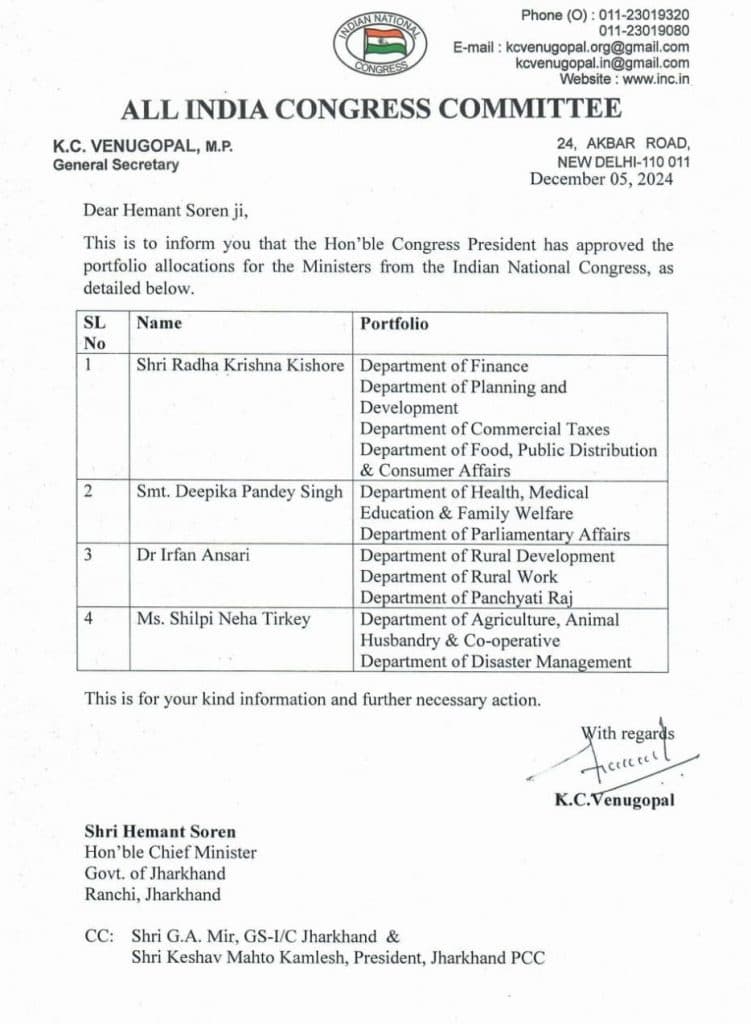 झारखंड के मंत्रियों के विभाग बंटने से पहले केसी वेणुगोपाल की चिट्ठी Viral, 3 बजे कैबिनेट की बैठक