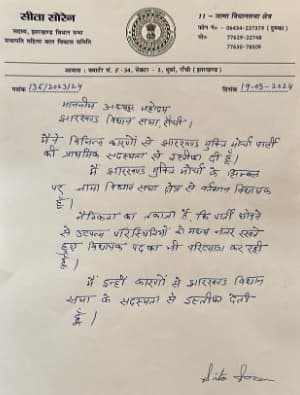 जामा विधायक सीता सोरेन ने झामुमो सुप्रीमो को शुक्रिया अदा कर उन्हें शुभकामनाएं दी है. साथ ही साथ उन्होंने यह आग्रह भी किया है कि उनके इस्तीफे को स्वीकार कर लिया जाए.