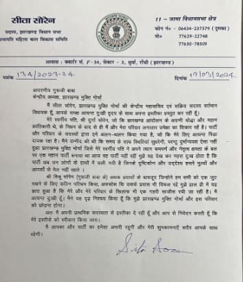सीता सोरेन आगे अपने पत्र में लिखती है कि गुरुजी शिबू सोरेन ने हम सब को एकजुट रखने का भरसक प्रयास किया. लेकिन मुझे अफसोस है कि उनका प्रयास भी विफल रहा. हाल ही में मुझे अहसास हुए कि मेरे और मेरे परिवार के खिलाफ गहरी साजिश रची जा रही है. मैं अत्यंत दुखी हूं. मैंने ये दृढ़ निश्चय किया है कि मुझे झारखंड मुक्ति मोर्चा और इस परिवार को छोड़ना होगा.