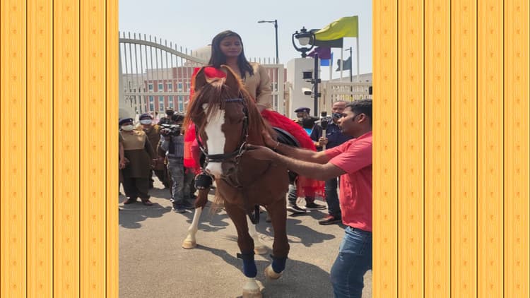 Jharkhand News, Ranchi News, रांची न्यूज : 8 मार्च यानी अंतरराष्ट्रीय महिला दिवस के अवसर बड़कागांव विधायक अंबा प्रसाद एक अलग अंदाज में दिखी. झारखंड विधानसभा के बजट सत्र में भाग लेने के लिए अंबा प्रसाद घोड़े पर सवार होकर विधानसभा पहुंची. इस अंदाज में बजट सत्र में भाग लेने के लिए विधानसभा पहुंचते ही चर्चा का विषय बन गयी अंबा प्रसाद. बता दें कि इससे पहले विधायक अंबा प्रसाद विधानसभा में साइकिल चलाते हुए भी देखी गयी थी. इधर, मुख्यमंत्री हेमंत सोरेन ने भी राज्य की सभी महिला विधायक समेत अन्य महिलाओं को शुभकामनाएं दी है. इस दौरान महिला विधायकों को सीएम श्री सोरेन ने उपहार भेंट कर सम्मानित भी किया.