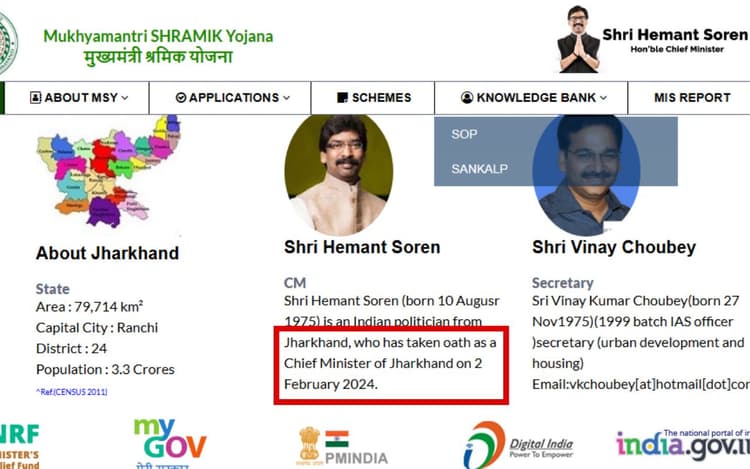 झारखंड मुक्ति मोर्चा (झामुमो) के कार्यकारी अध्यक्ष हेमंत सोरेन ने एक बार फिर झारखंड के मुख्यमंत्री के रूप में शपथ ली. यह तारीख थी- 28 नवंबर 2024. अगर आप झारखंड सरकार के श्रम मंत्रालय के पोर्टल पर जाएंगे, तो ‘मुख्यमंत्री श्रमिक योजना’ सेक्शन में मुख्यमंत्री हेमंत सोरेन और श्रम विभाग के सचिव के बारे में जानकारी दी गई है.