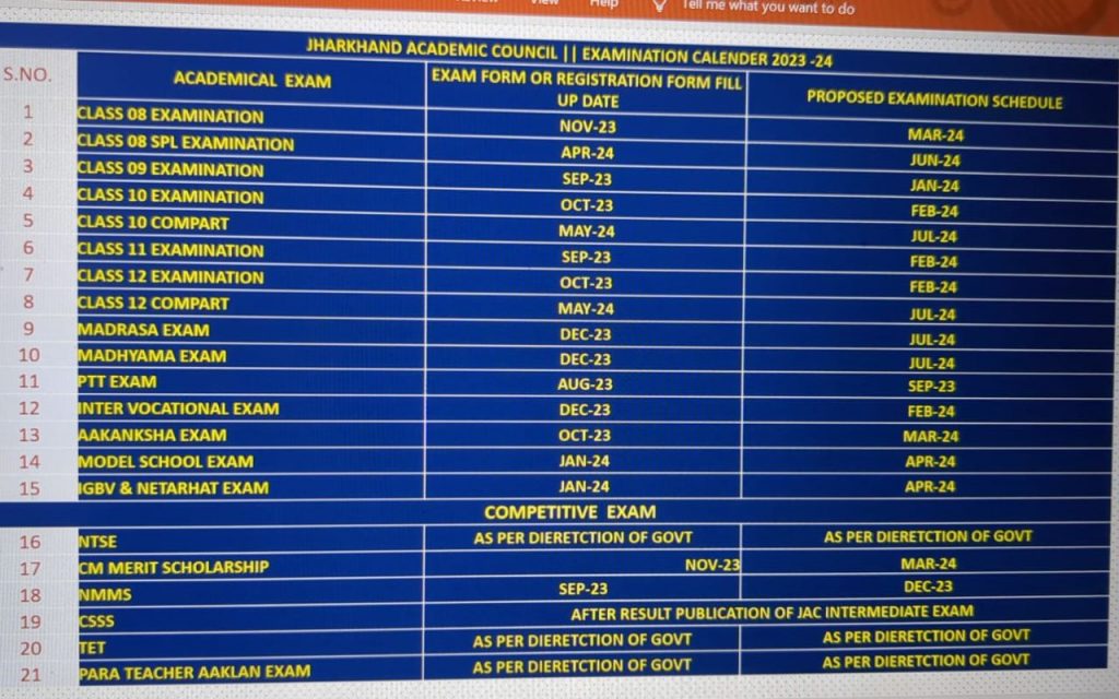 मुख्यमंत्री मेरिट स्कॉलरशिप इम्तहान मार्च 2024 में होंगे, जिसके लिए पंजीकरण नवंबर 2023 में कराना होगा. एनएमएमएस की परीक्षा इसी साल दिसंबर में होगी. इसके लिए पंजीकरण इसी महीने कराना होगा. सीएसएसएस की परीक्षा की तारीख जैक इंटर का रिजल्ट जारी होने के बाद घोषित की जाएगी. वहीं, टेट और पारा टीचर आकलन परीक्षा सरकार के निर्देश पर आयोजित किए जाएंगे.