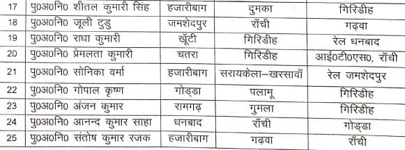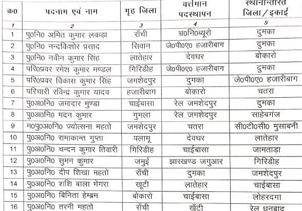 उसी तरह पु. नि. नंदकिशोर प्रसाद जे.पी.ए हजारीबाग से दुमका ट्रांसफर कर दिया गया है. पु. नि. नवीन कुमार सिंह को देवघर से बोकारो, परि. प्रवर रमेश कुमार मंडल जे.पी.ए हजारीबाग से दुमका, परि. प्रवर विकास कुमार सिंह को दुमका से जे.पी.ए हजारीबाग, परिचारी रवींद्र कुमार यादव को बोकारो से चतरा, पु.अ.नि. जमादार मुंडा को रेल जमशेदपुर से दुमका, पु.अ.नि. मदन कुमार रेल जमशेदपुर से साहिबगंज, म.पु.अ.नि ज्योत्सना महतो को चतरा से सीटीसी मुसाबनी, पु.अ.नि रमाकांत गुप्ता को देवघर से लातेहार तबादला कर दिया गया है. सभी जिला के पुलिस अधीक्षकों को निर्देश दिया गया है कि वे ज्वॉइनिंग से संबंधित प्रतिवेदन पुलिस मुख्यालय रांची को उपलब्ध कराने को कहा गया है. तबादला से संबंधित पूरी सूची आप यहां से देख सकते हैं.
