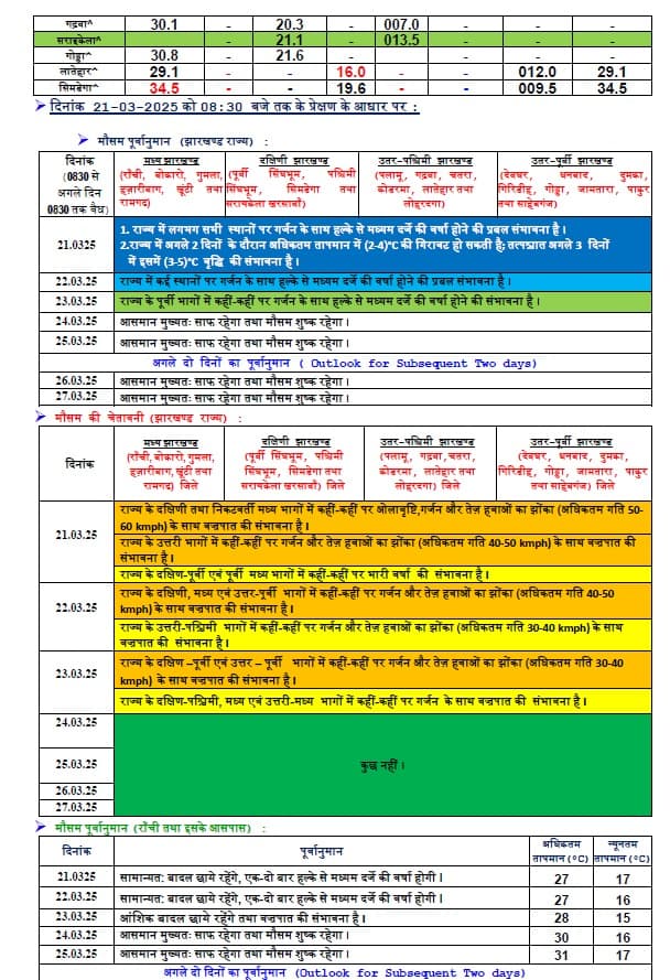 मौसम विज्ञान केंद्र के वैज्ञानिक अभिषेक आनंद ने कहा है कि यही स्थिति 22 मार्च यानी शनिवार को भी रहेगी. पूरे राज्य में ऑरेंज अलर्ट जारी किया गया है. 23 मार्च से मौसम में बदलाव होगा. आसमान धीरे-धीरे साफ होंगे. सिर्फ पूर्वी भाग जिनमें कोल्हान, संताल परगना में गर्जन व वज्रपात के साथ बारिश हो सकती है. हवा की गति 30 से 40 किलोमीटर प्रति घंटा रहने की संभावना है. 24 मार्च से अधिकतम तापमान में तीन से चार डिग्री सेल्सियस तक की बढ़ोतरी हो सकती है. पिछले 24 घंटे में राज्य में सबसे अधिक बारिश चाईबासा में रिकॉर्ड किया गया है. यहां 54 मिमी बारिश हुई है, जबकि रांची में लगभग 30 मिमी बारिश हुई.