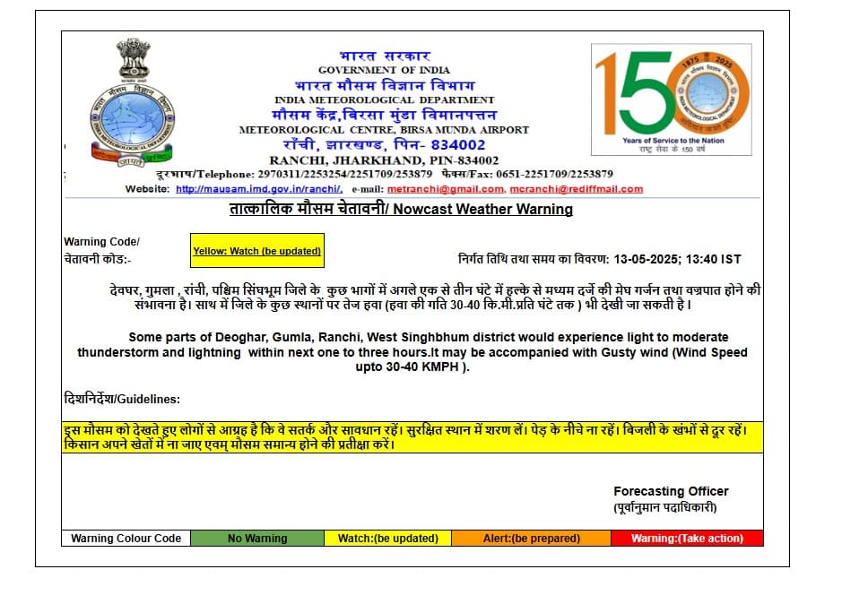 Jharkhand Weather Alert: रांची समेत आठ जिलों में तपती गर्मी से लोगों को कुछ ही घंटे में राहत मिलेगी. आईएमडी ने अपने पूर्वानुमान में बताया है कि तीन घंटे के अंदर कोल्हान समेत अन्य जिलों में तेज हवाओं के साथ बारिश हो सकती है. गरज के साथ वज्रपात की भी आशंका है. येलो अलर्ट जारी किया गया है.