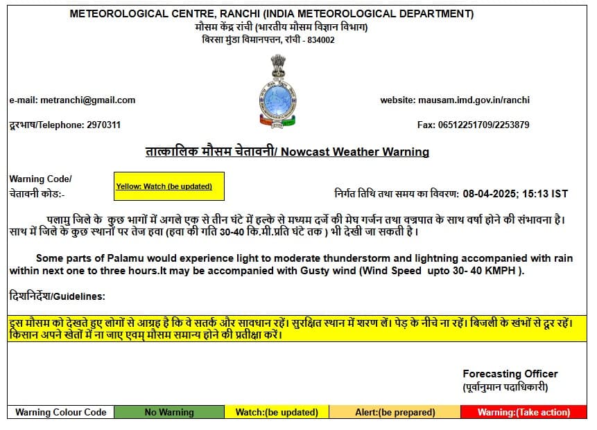 मौसम विभाग ने एक और अलर्ट जारी किया है. इसके अनुसार पलामू जिले में अगले एक से तीन घंटे में तेज हवाओं के साथ बारिश हो सकती है. गरज के साथ वज्रपात भी हो सकता है. मौसम विभाग ने येलो अलर्ट जारी किया है.