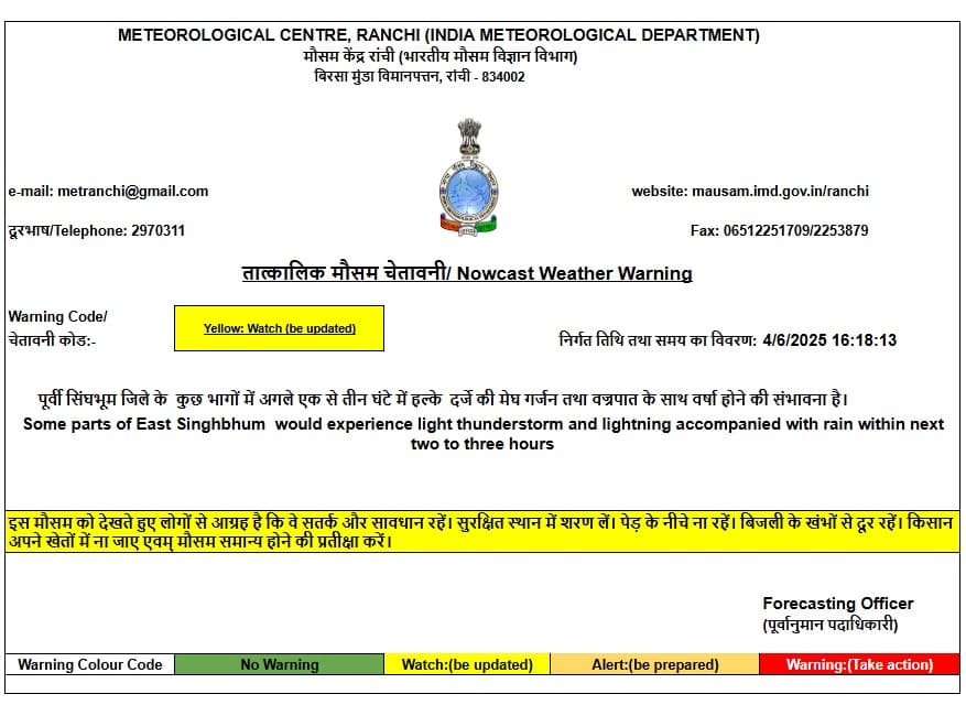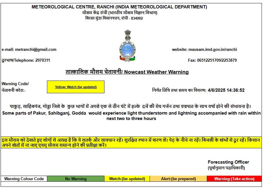 मौसम वैज्ञानिकों ने आम लोगों से अपील की है कि मौसम खराब रहने पर सतर्क रहें. सावधान रहें. खासकर घर से बाहर रहने पर काफी सजग रहने की जरूरत है. बारिश के दौरान भूल कर भी पेड़ के नीचे नहीं ठहरें. सुरक्षित स्थान पर ही रुकें. बिजली के खंभों से भी दूरी बनाकर रखें. मौसम विभाग ने पूर्वी सिंहभूम, पाकड़, गोड्डा और साहिबगंज के लिए येलो अलर्ट जारी किया है.