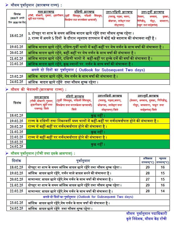 मौसम विज्ञान केंद्र के वैज्ञानिक अभिषेक आनंद के अनुसार पूरे राज्य में एक साथ बारिश नहीं होगी. बल्कि अलग-अलग जिलों में अलग-अलग समय में बारिश हो सकती है. कई जिले में सिर्फ मेघ गर्जन और वज्रपात हो सकते हैं. रांची में 21 फरवरी को सुबह में धुंध व दिन में आकाश में बादल छाये रहेंगे. मंगलवार को सबसे अधिक तापमान सरायकेला का 36.8 डिग्री सेल्सियस रिकॉर्ड किया गया. वहीं, रांची का अधिकतम तापमान 29 डिग्री व न्यूनतम तापमान 14.4 डिग्री सेल्सियस रहा. मौसम विभाग ने 19, 20 और 22 फरवरी को येलो अलर्ट जारी किया है.