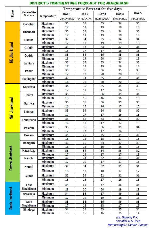 झारखंड के सभी जिलों के न्यूनतम और अधिकतम तापमान