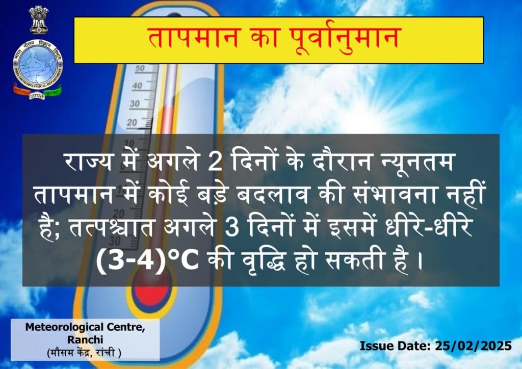 झारखंड में अगले दो दिनों के दौरान न्यूनतम तापमान में कोई बड़े बदलाव की संभावना नहीं है. इसके बाद अगले तीन दिनों में इसमें धीरे-धीरे तीन से चार डिग्री सेल्सियस की वृद्धि हो सकती है.