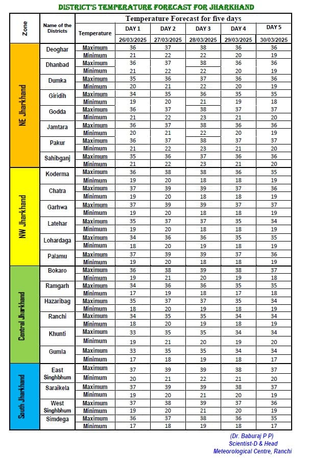 झारखंड के सभी जिलों के न्यूनतम और अधिकतम तापमान