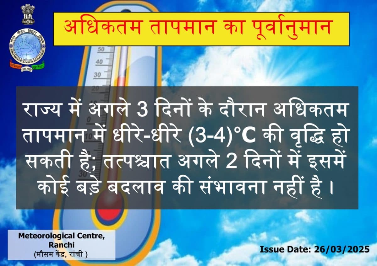 झारखंड में अगले तीन दिनों के दौरान अधिकतम तापमान में धीरे-धीरे तीन से चार डिग्री सेल्सियस की बढ़ोत्तरी हो सकती है. इसके बाद अगले दो दिनों में इसमें कोई बड़े बदलाव की संभावना नहीं है.
