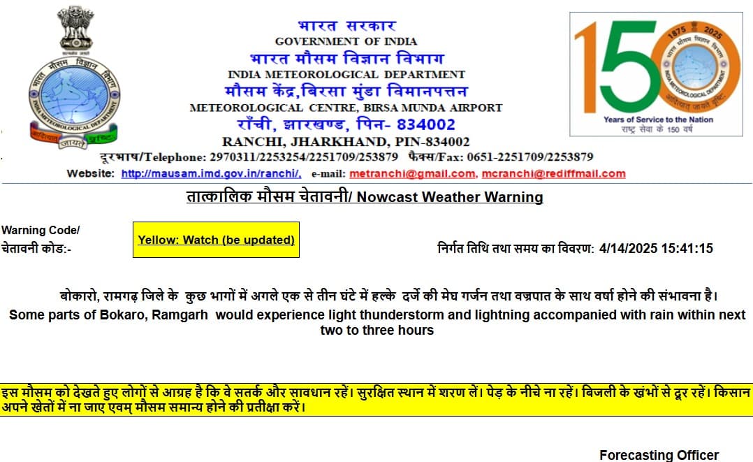 मौसम विभाग ने अपने पूर्वानुमान में बताया है कि बोकारो और रामगढ़ जिले में भी मौसम का मिजाज बदलेगा. कुछ ही घंटे में वहां भी मेघ गर्जन के साथ बारिश हो सकती है. वज्रपात की भी आशंका है. मौसम विभाग ने येलो अलर्ट जारी किया है.