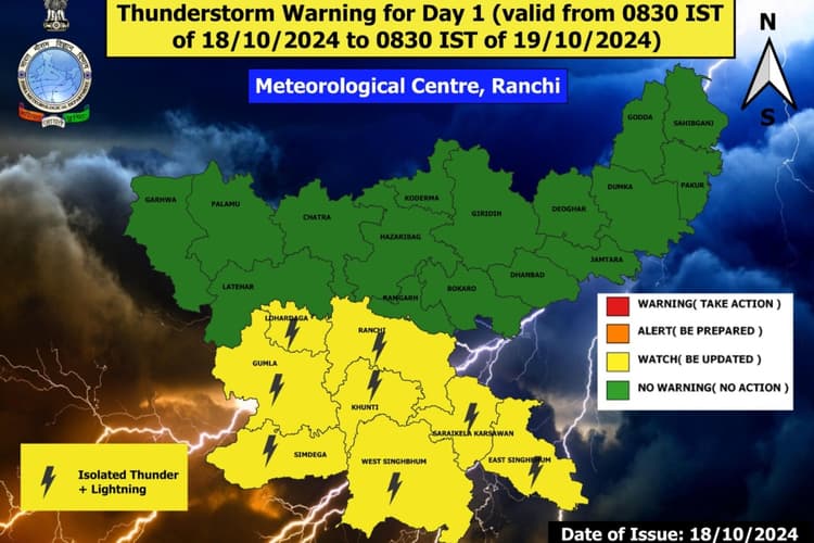 मौसम विभाग ने कहा कि राजधानी रांची, खूंटी, गुमला, सिमडेगा, लोहरदगा, सरायकेला-खरसावां, पूर्वी सिंहभूम और पश्चिमी सिंहभूम में गरज के साथ बारिश हो सकती है. इस दौरान मौसम विभाग ने लोगों को आसमानी बिजली से बचने और बाहर न निकलने की सलाह दी है. आईएमडी ने इसके लिए येलो अलर्ट जारी किया है.
