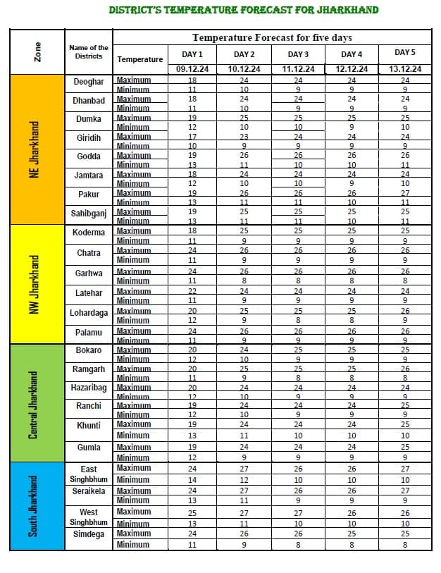 झारखंड के सभी जिलों के लिए अधिकतम और न्यूनतम तापमान