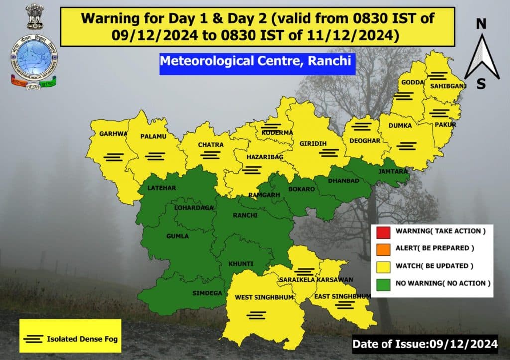 मौसम विभाग ने झारखंड के जिन 14 जिलों के लिए घने कोहरे का अलर्ट जारी किया है, उनमें गढ़वा, पलामू, चतरा, हजारीबाग, कोडरमा, गिरिडीह, देवघर, दुमका, गोड्डा, साहिबगंज, पाकुड़, सरायकेला-खरसावां, पश्चिमी सिंहभूम और पूर्वी सिंहभूम शामिल हैं. सुबह में लोगों से सावधानी के साथ बाहर निकलने की अपील की गयी है.