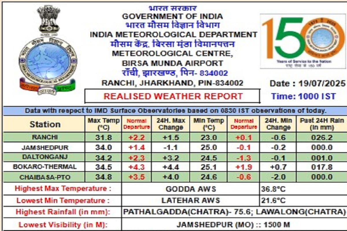 मालूम हो कि रांची के तापमान में 1.5 डिग्री सेल्सियस की बढ़ोत्तरी दर्ज की गयी है. जिले का अधिकतम तापमान 31.8 रहा. इस दौरान राज्य में सबसे अधिक गर्म शहर गोड्डा रहा, जहां का तापमान 36.8 डिग्री सेल्सियस दर्ज किया गया. जबकि सबसे ठंडा जिला लातेहार रहा, जहां का तापमान 21.6 डिग्री सेल्सियस रहा.
