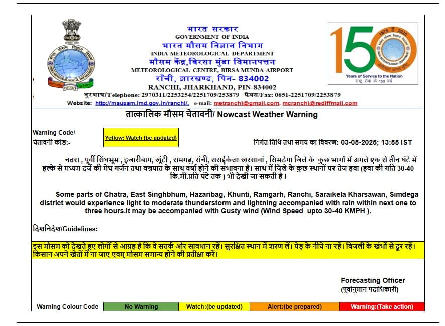 रांची समेत 8 जिलों के लिए येलो अलर्ट