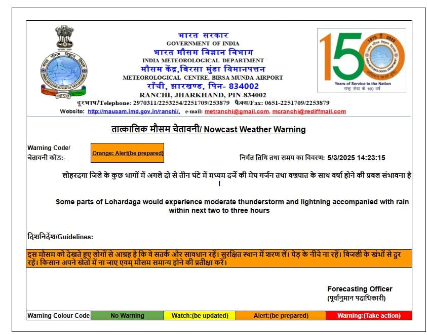 लोहरदगा जिले के लिए ऑरेंज अलर्ट जारी