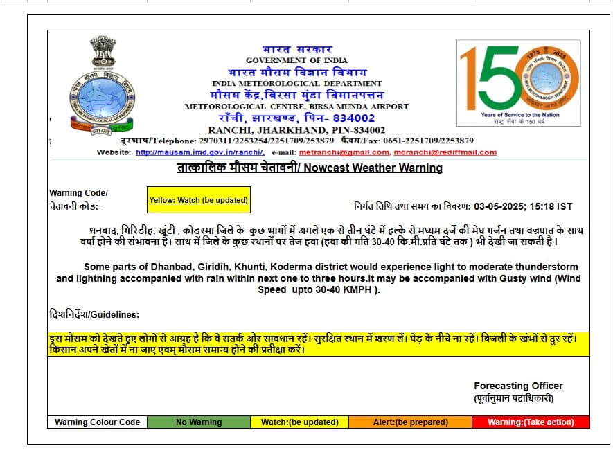 धनबाद समेत चार जिलों के लिए येलो अलर्ट