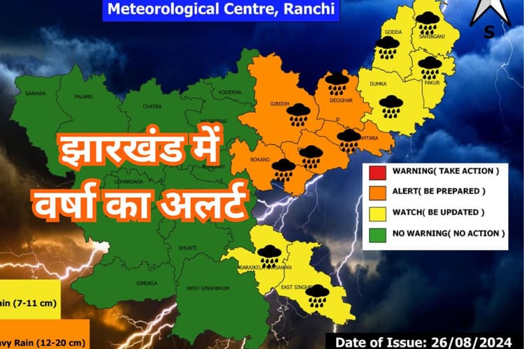 बहरहाल, अभिषेक आनंद ने बताया कि मंगलवार (27 अगस्त) को झारखंड में कहीं-कहीं गरज के साथ वर्षा होगी. कुछ जगहों पर वज्रपात भी होने की संभावना है. उन्होंने कहा कि राज्य के उत्तर-पूर्वी भागों यानी देवघर, दुमका, गोड्डा, जामताड़ा, पाकुड़, साहिबगंज, धनबाद और गिरिडीह जिले में कुछ जगहों पर भारी वर्षा हो सकती है.